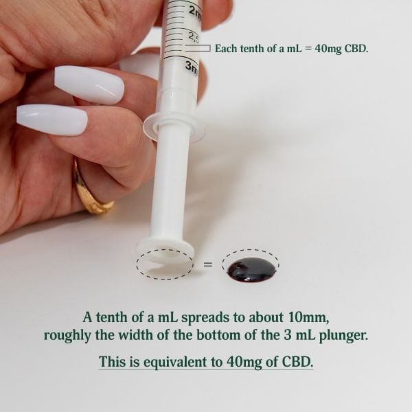 0.1 mL spreads to about 10 mm, roughly the width of the bottom of the 2.5 mL plunger. This is equivalent to 40 mg of CBD.